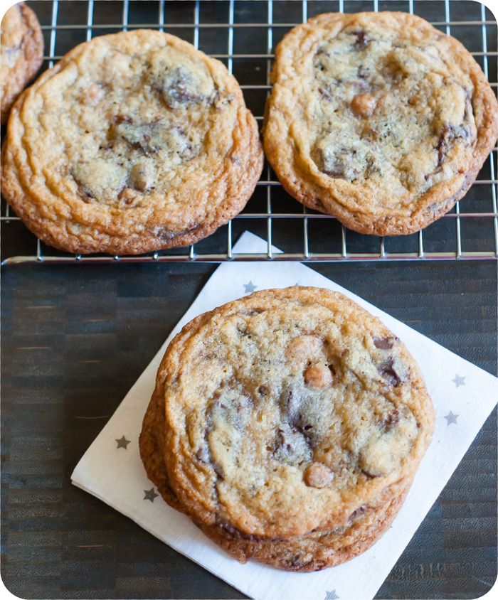 Let me tell you about these cookies. First, I love a soft, puffy cookie, but these are not those. Because of the caramel bits baked in, I wanted a chewy, thin, buttery cookie. These are basically a version of the good ol' Toll House Cookie (thank you, Ruth Wakefield, American hero) with a few twists.